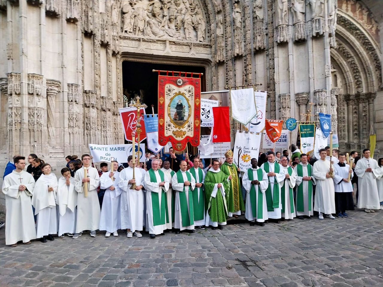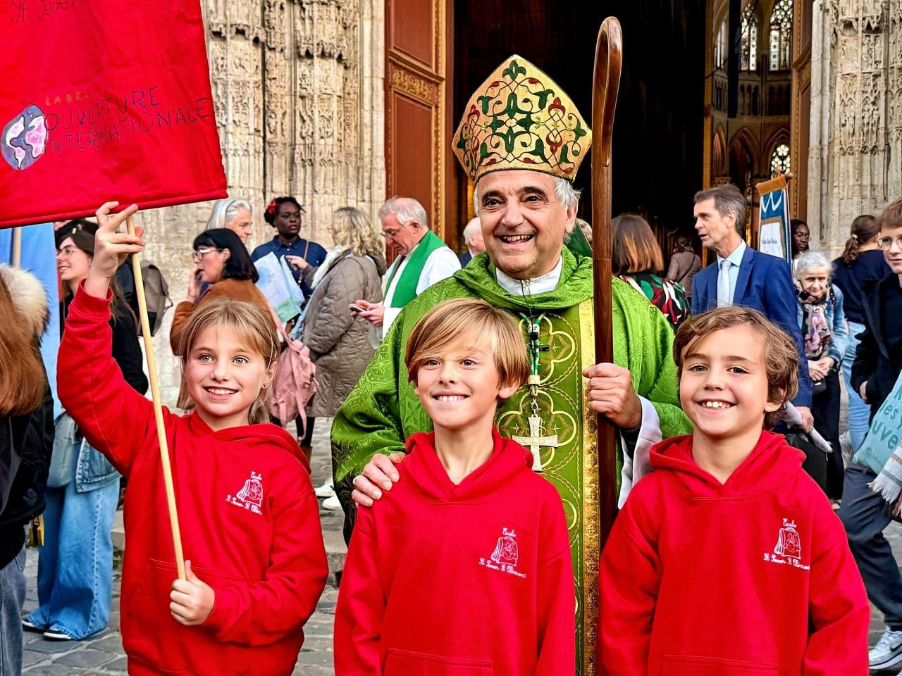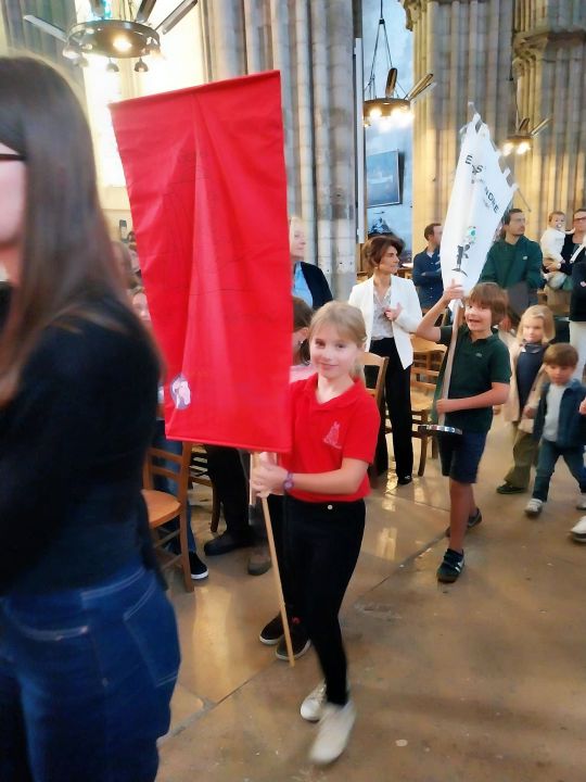 Mardi 30 septembre, les établissements de l'enseignement catholique ont fêté la rentrée lors d'une messe organisée comme chaque année à la cathédrale et présidée par monseigneur Lebrun. Nos délégués pastoraux étaient présents et très fiers de porter la bannière de l'école.